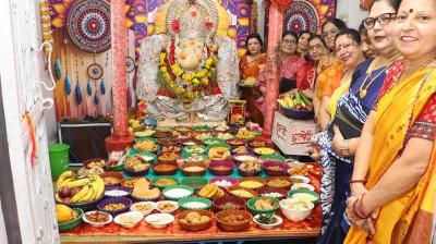 सर्व ब्राह्मण महिला एकता परिषद ने श्री गणेश देवस्थानम में भगवान गजानन को लगाए 108 भोग
